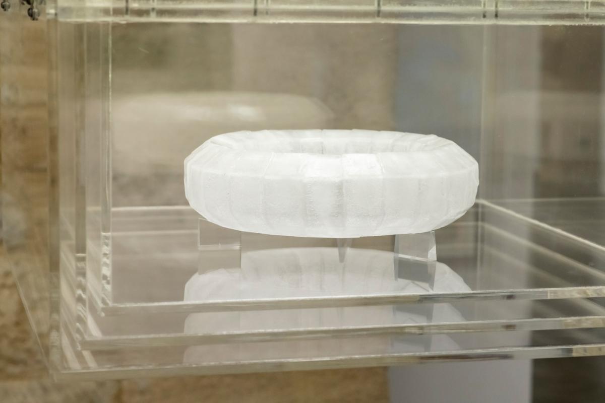 En compagnie de la commissaire de l’exposition Alice Cavender et de la chargée de production Emma Blanchard, venez découvrir l’univers du Cristal liquide, œuvre majeure de Jean Sabrier commencée en 1982. Il s'agit de la sculpture d’un mazzocchio en glace, constituée de 192 facettes.