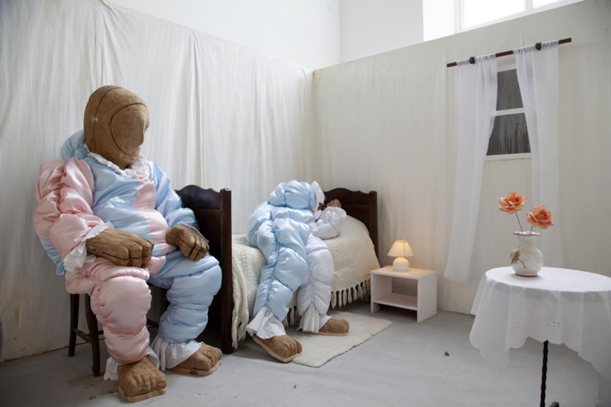 Les œuvres d’Angélique Aubrit sont très souvent réalisées en textile – suivant les principes du DIY – autant par nécessité que pour l’esthétique qui en ressort. Ses créations figurent des narrations de personnages flottant, présents ou absents, affecté·e·s par des situations sociales décevantes, voire désespérantes. Il règne alors un état psychologique névrosé, proche de la folie, mais qui ne se laisserait pas observer de l’extérieur, parce qu’elle concerne autant l’observateur que l’observé. Pourtant Angélique Aubrit se refuse à tout pessimisme et il s’agit ici d’accepter un état civilisationnel, une réalité, afin d’en écrire les nouvelles formes de défoulements collectifs.
