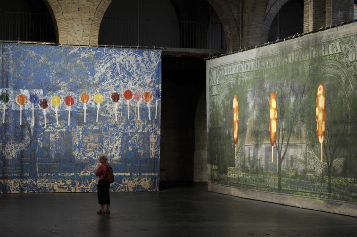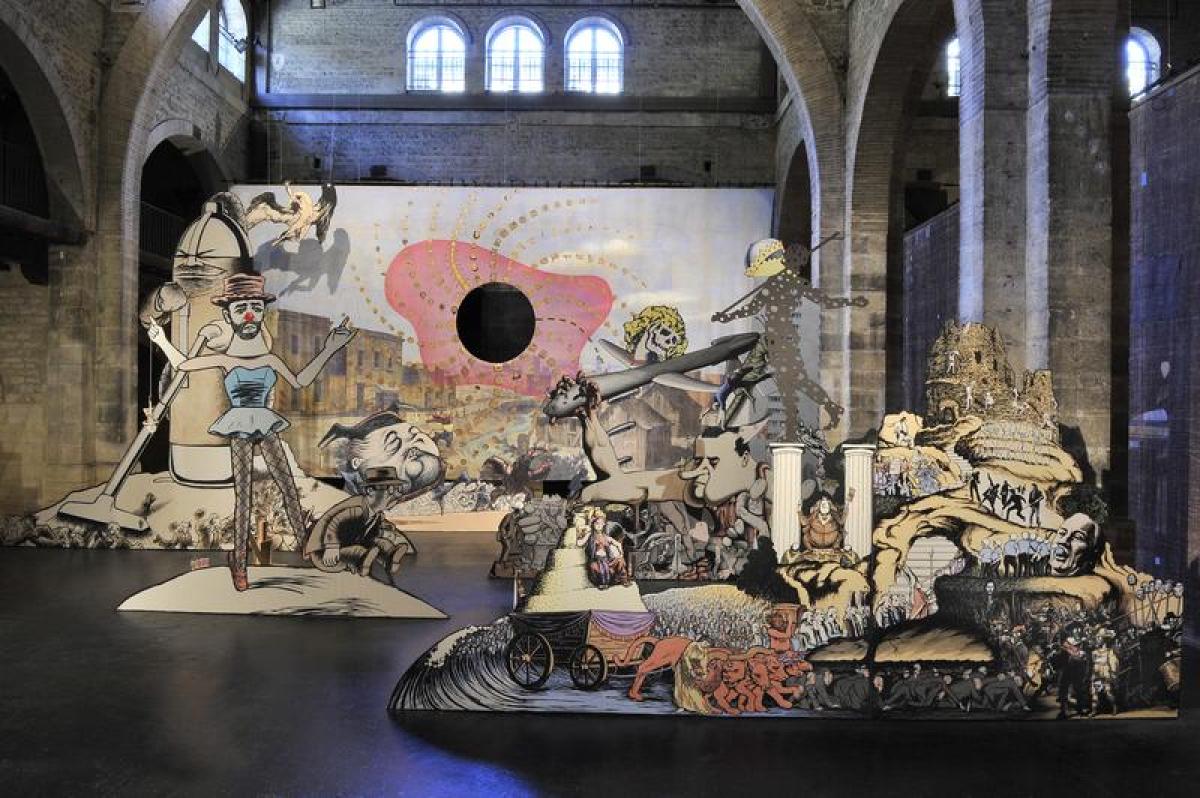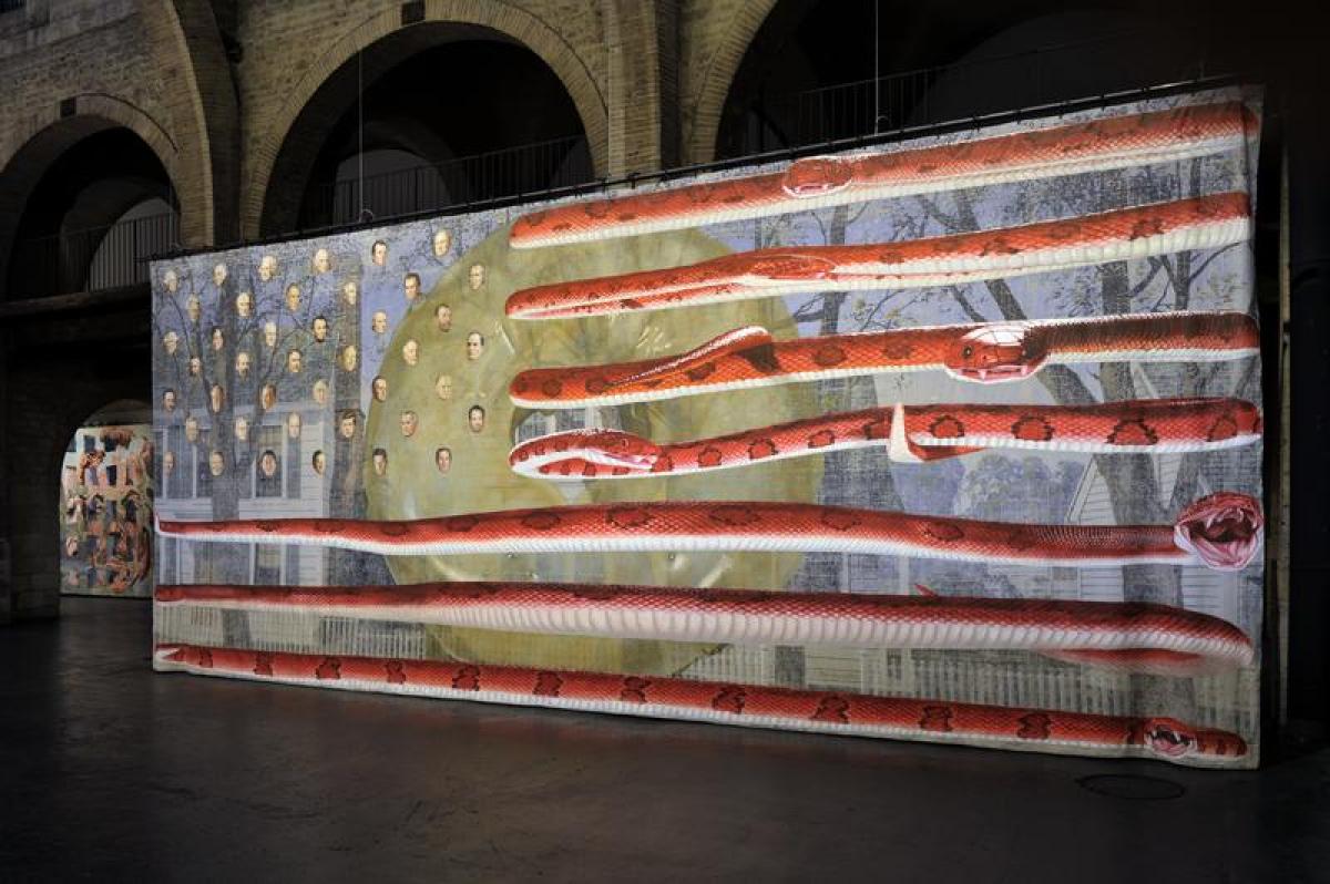 Pour la première fois, cette exposition rassemble 15 peintures monumentales qui ont été réalisées par l’artiste ces dix dernières années. Elles s’accompagnent de sculptures dont une sculpture géante gonflable et d’une collection inédite, rassemblée par l’artiste, d’objets chrétiens qui font appel à une iconographie apocalyptique.
