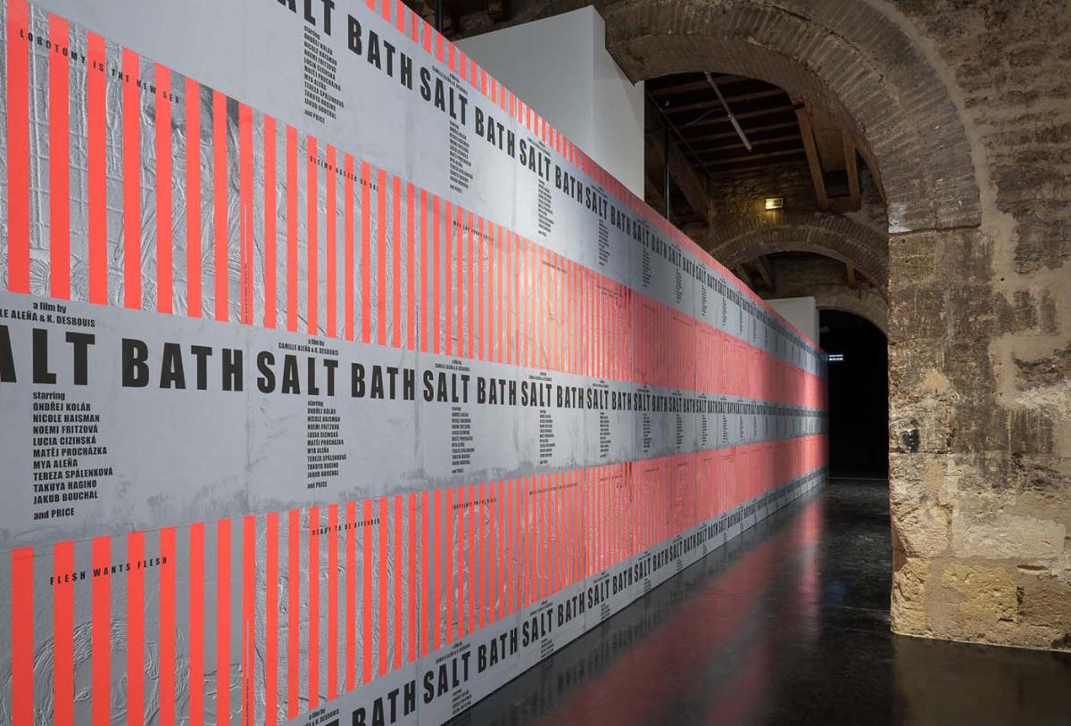 Salt Bath immerses us in the characters’ reflections—both mundane and existential—who serve as their own stand-ins, caught in a non-linear, spiral-shaped narrative. The film’s very title—Salt Bath—suggests a form of cleansing, transition, or a skin-deep purification process that ultimately leads to irritation. These successive metamorphoses extend into the exhibition itself, which becomes, indistinctly, a screening space, a casting room, a teaser, as well as dressing rooms or backstage areas.