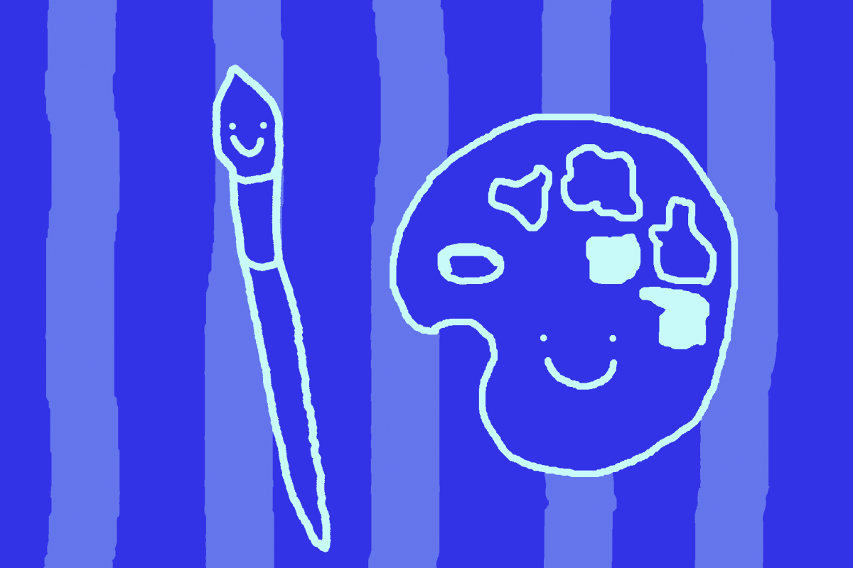 Dessin naïf d'un pinceau et d'une palette sur un fond alternant des bandes de couleur violette foncée et claire