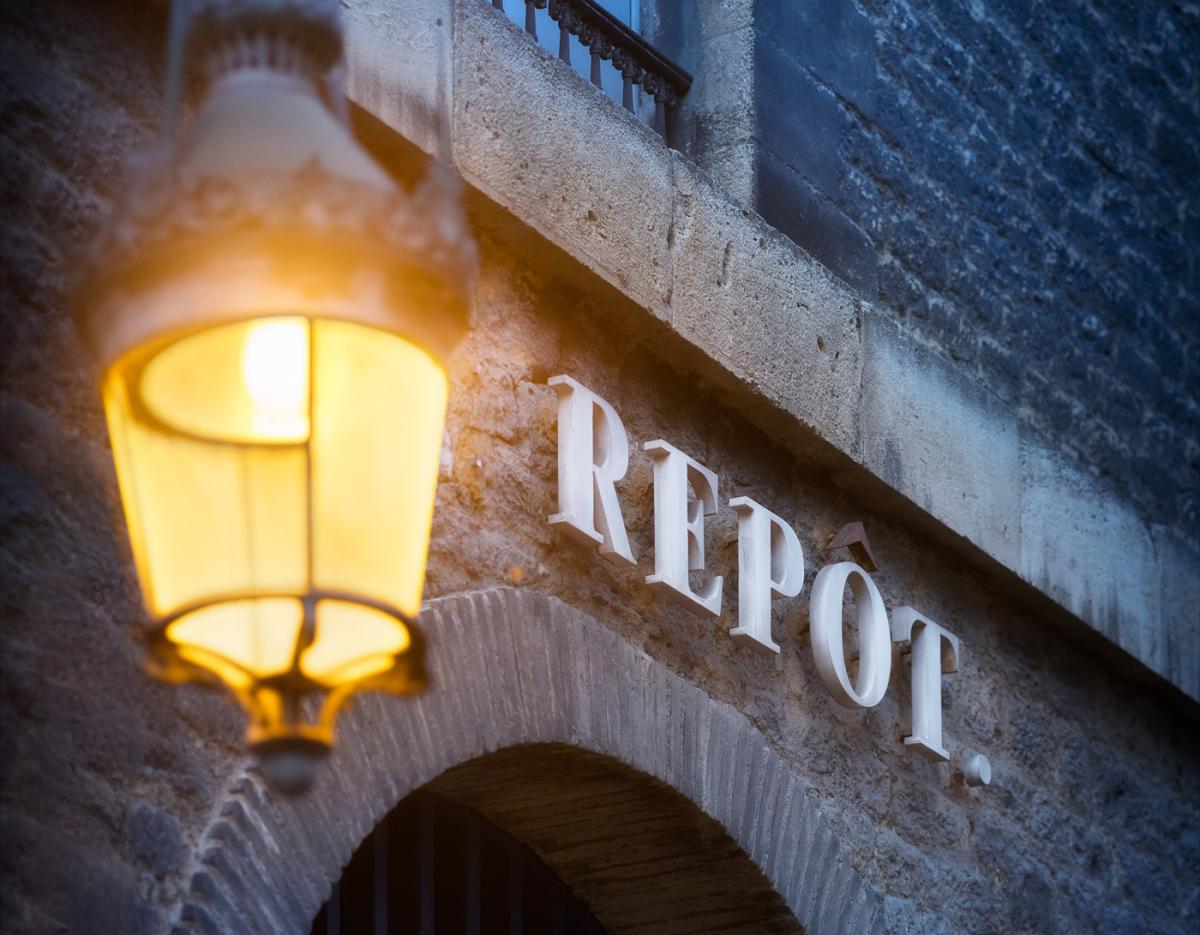 Sur la façade d'un bâtiment en pierre, un lampadaire éclaire d'une lumière jaune 5 lettres qui forment le mot : REPOT