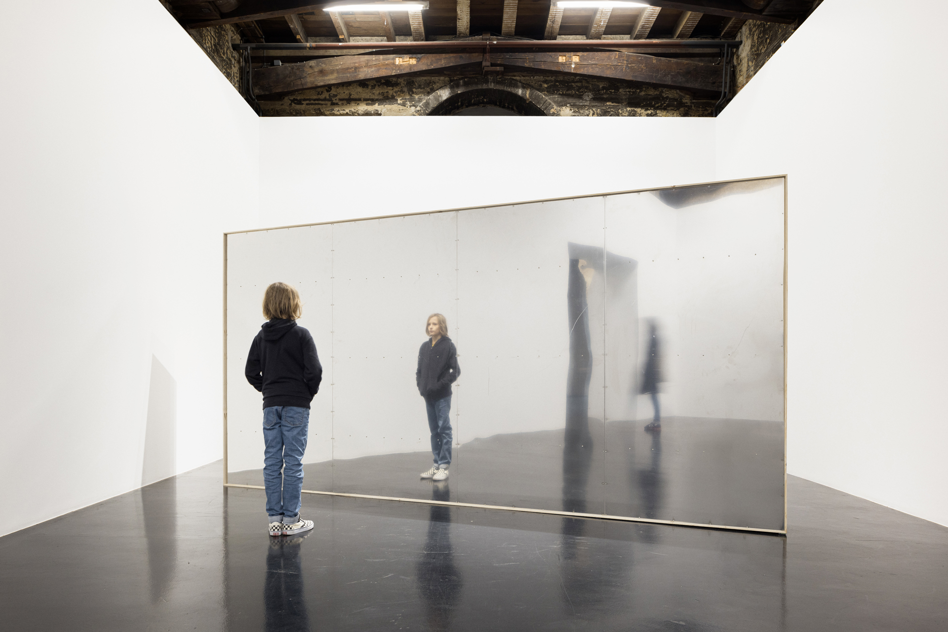 Un adolescent seul dans un espace d'exposition regarde son reflet dans un miroir